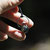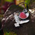 Auf der Vorderseite schmücken filigrane Pilze und ein roter Zirkonia die Phiole. Darin befindet sich ein kleiner Bergkristall, ein Splitter Bernstein und ein Zettelchen "Ein Hoch auf dein Herz, es hat die Macht deine Welt zu verändern"