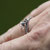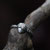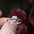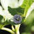 Von Hand hergestellter Hortensienring aus massivem Silber. Auf den Seiten sind kleine Waldwelten mit Mond und Sternen versteckt eingearbeitet.
